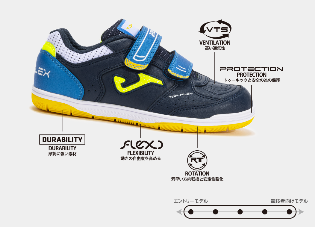 Jomaのフットサルへの知識を初心者向けに投入したエントリーモデルのフットサルシューズ。フットサルを覚える為の最初のステップに必要であるシューズとしての快適さとボールコントロール力を高い価値で提供します。
