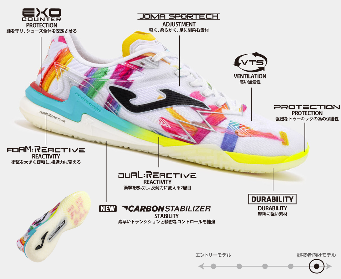 アッパーは安定性と耐久性の高い人工素材を使用しており、 VTS マイクロパーフォレーション システムにより通気性が向上しています。つま先は従来のJomaフットサルシューズのランナップよりも更に強烈なトゥーキックを可能にする為に硬く強化されています。